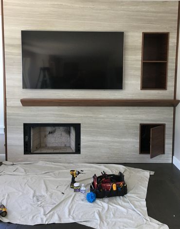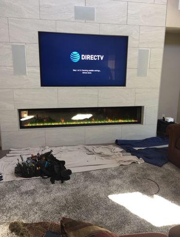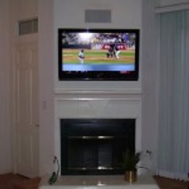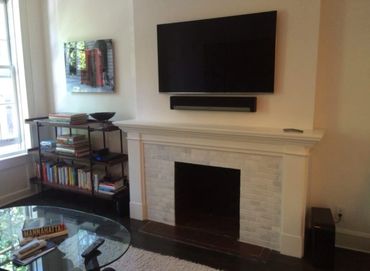 Please note that installing a TV above a fireplace can be a fire hazard if not done properly. The wires cannot contact or come close to contacting any part of the fireplace or smoke stack. Installations like the one shown above shouldn’t need any excess holes to be cut in the drywall in order to get the wires hidden.